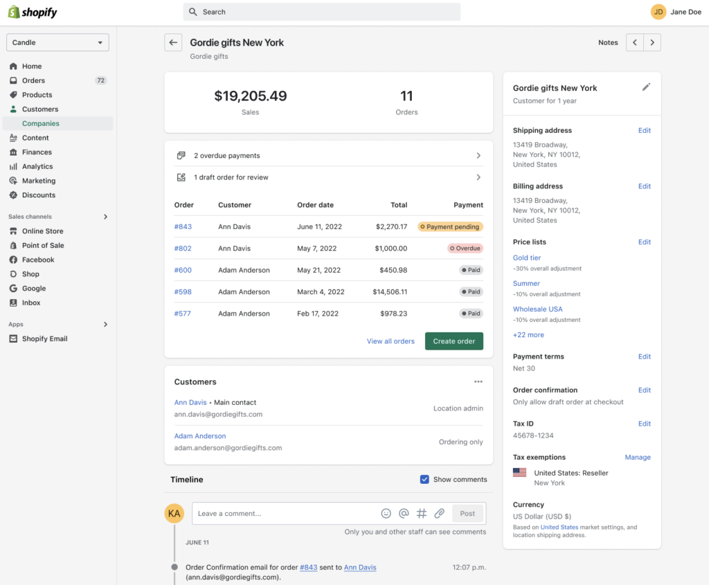 Sobald Sie die Phase des Verkaufsprozesses identifiziert haben, in der sich ein Interessent befindet, versuchen Sie, ihn auf Ihren Online-Shop umzuleiten. von Shopify Mit der B2B-E-Commerce-Plattform können Sie Folgendes tun, alles über dasselbe Back-End, das auch Ihr B2C-Storefront betreibt :